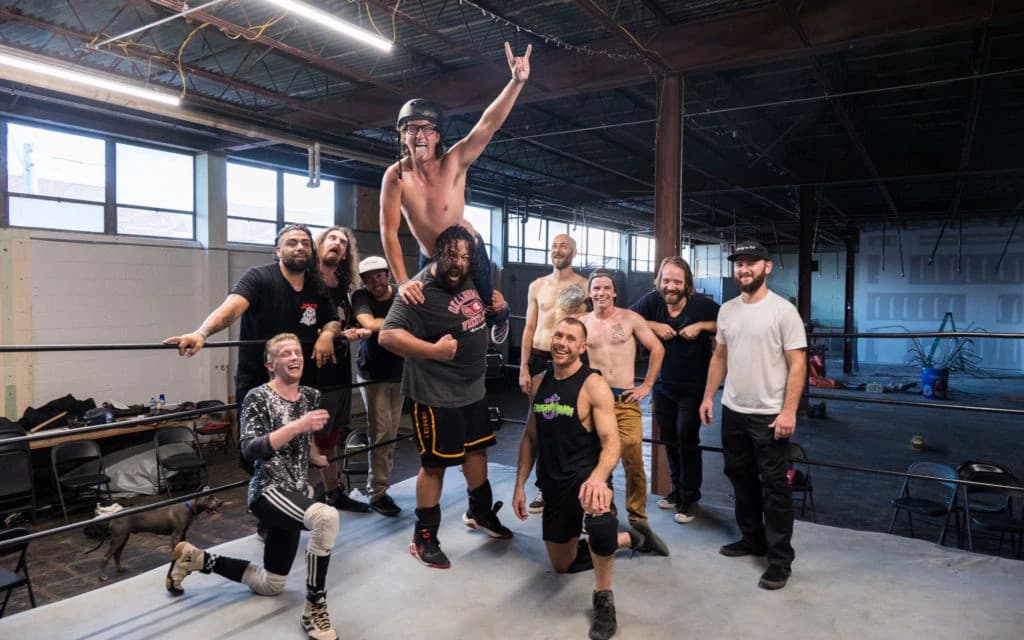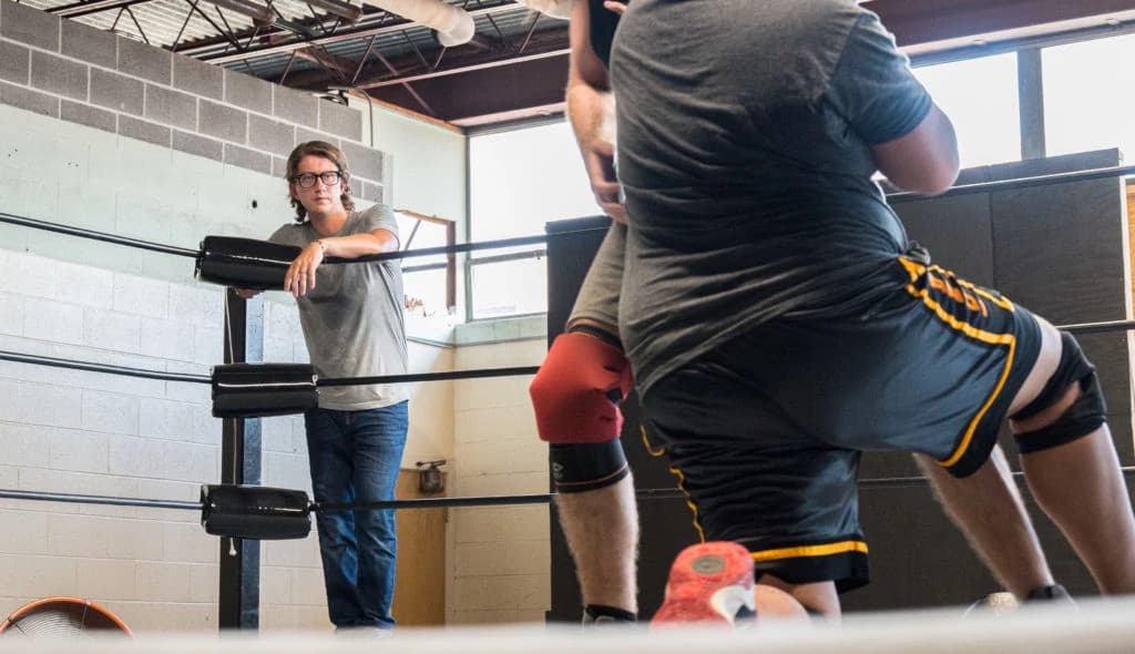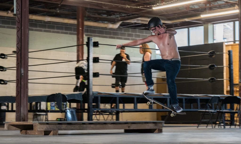 The skateboard has come to a brief halt near a pro wrestling ring, where class is in session. The last boom still echoes across this Kansas City warehouse when two sweaty dudes crash once more upon the canvas mat. They are trainees with Journey Pro Wrestling, the entertainment company and wrestling academy D.J. founded and helps run here at the Agnes Arts Center.