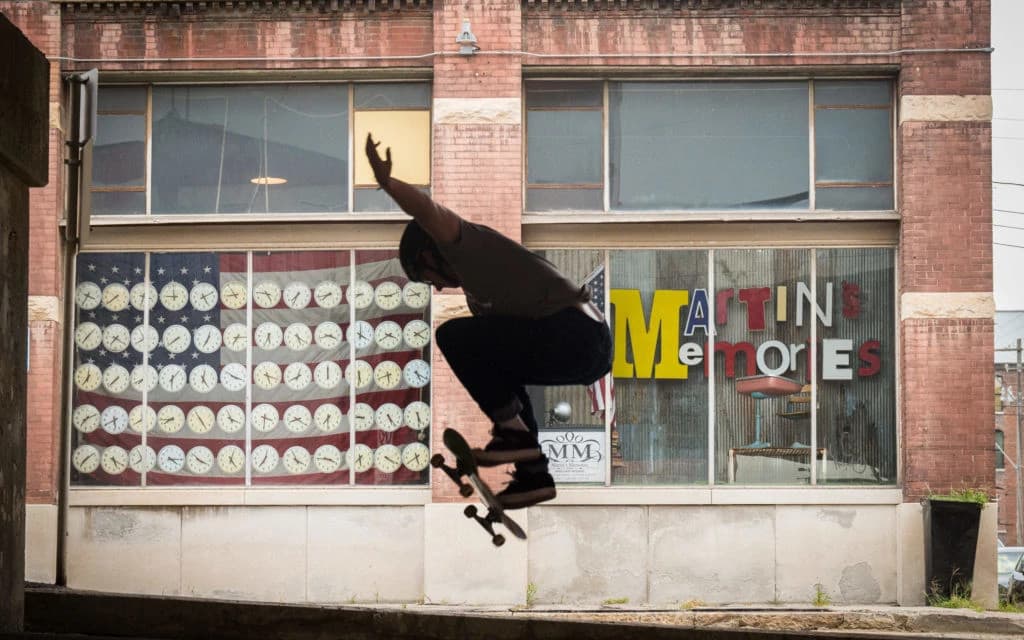 D.J. Stewart hits the concrete as his skateboard clatters away from a grind box. Friends groan — he’d nearly pulled off a kickflip manual kickflip out, landing on a revolving skateboard while airborne.