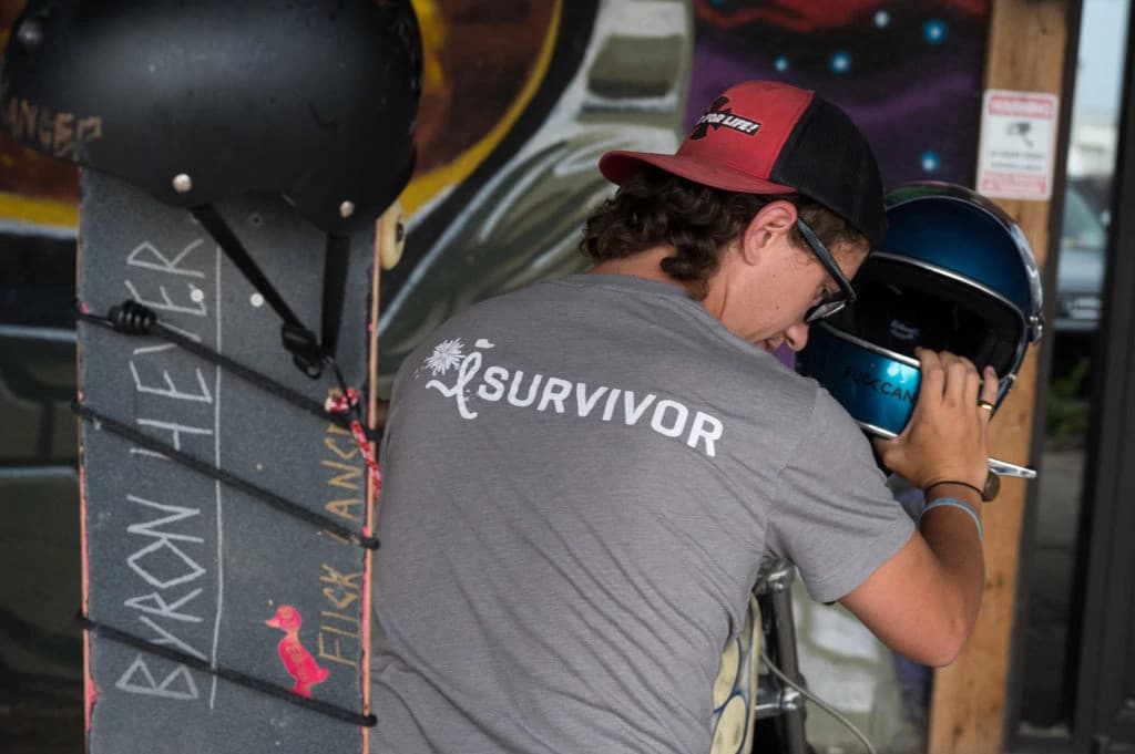 Once more, he picks himself up, chases the board and adjusts his helmet. It’s emblazoned with the words, Fuck Cancer.