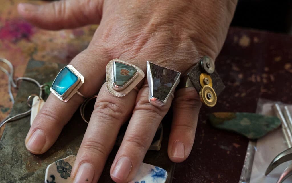Linda makes rings, bracelets and other jewelry out of objects she finds in nearby parks, at the beach and elsewhere. ‘Sometimes my friends will give me their old china or ceramics, which is nice, but I like finding it myself.’