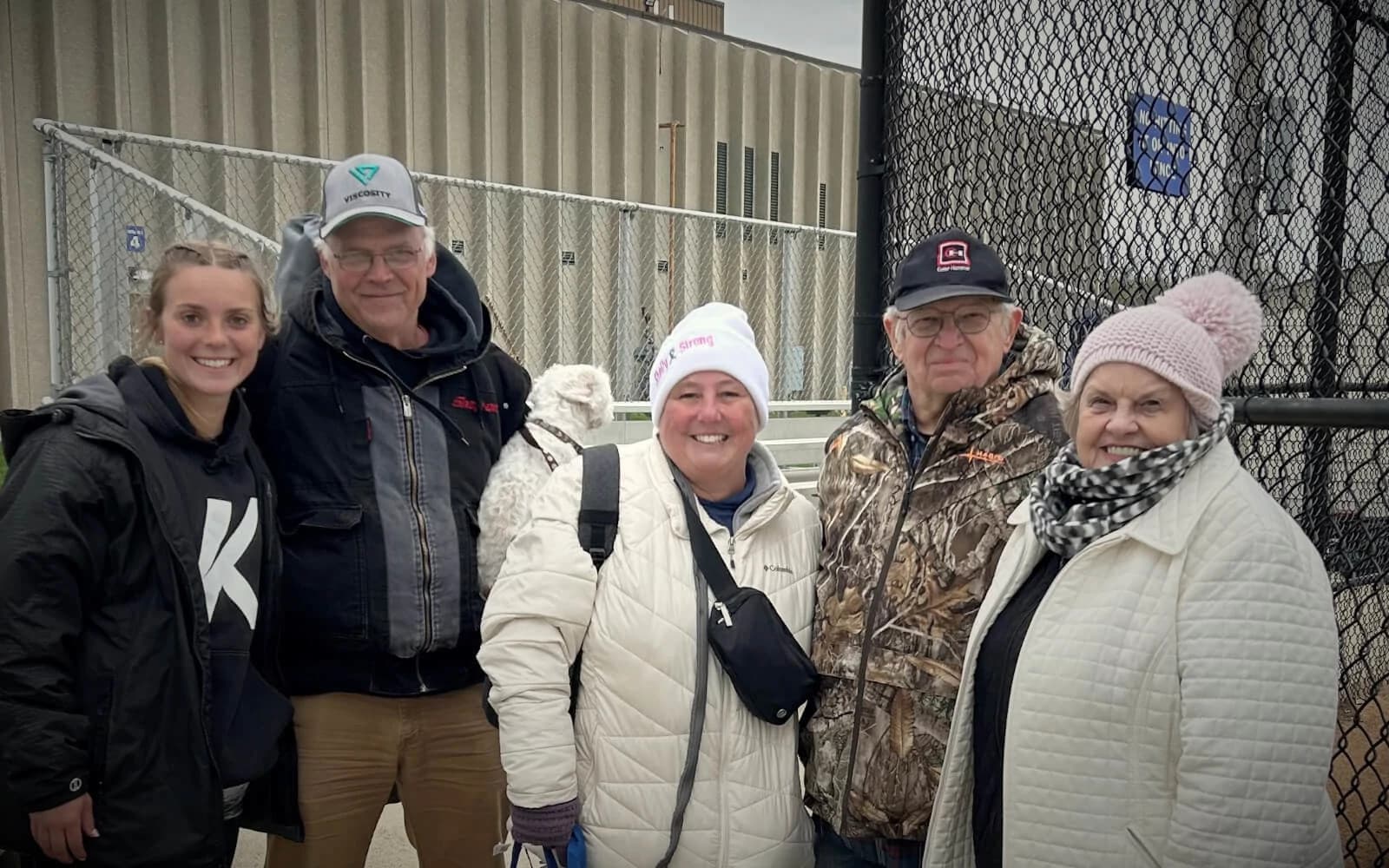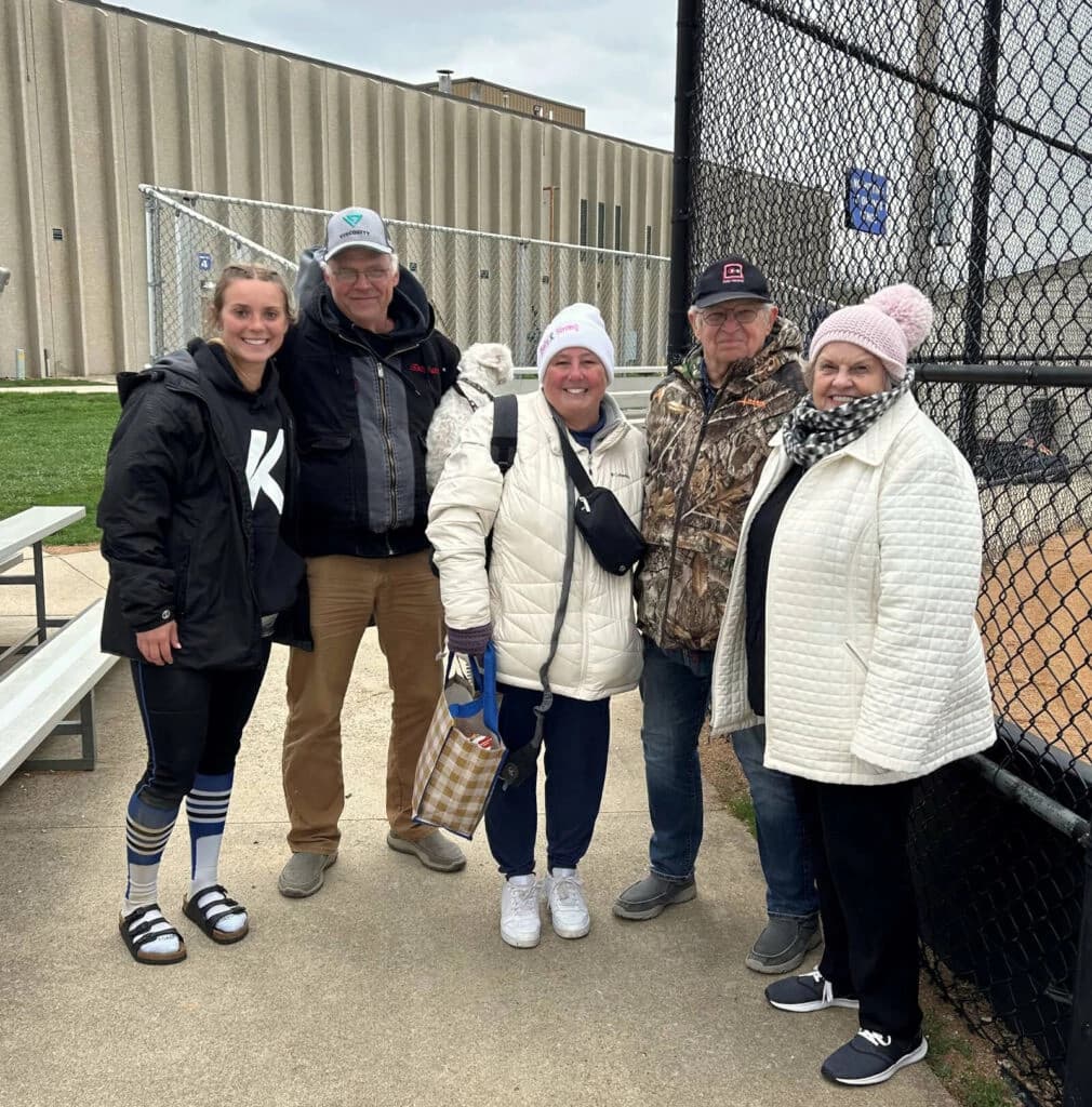 Shelly Zaugg (center) travels all over Iowa and beyond to see her daughter Grace (far left) compete as a college softball player. Since her diagnosis, which limits her ability to drive after dark, she is often joined by family. In this case, her husband, Gary, is pictured second from left, and Gary’s aunt and uncle, Jim and Alice, are on the far right.
